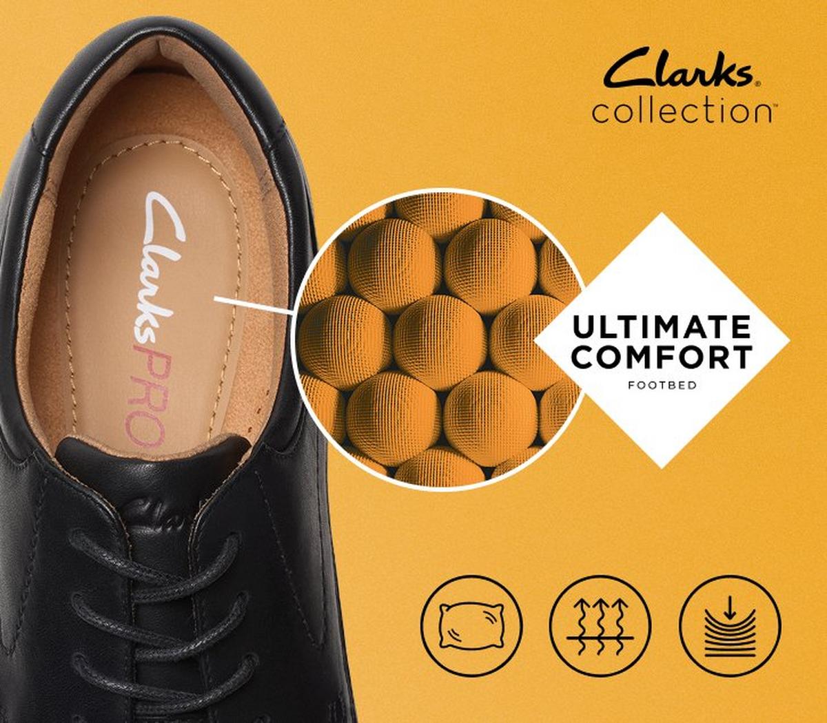 - چرمهای صاف با دوختهای هنرمندانه، ظاهری جاودانه به کفش میبخشند، در حالی که بالشتکهای سبک و فنری Clarks PRO حس راه رفتن روی هوا را در تمام طول روز ارائه میدهند. این کفش با کفی لاستیکی ضد لغزش، به شما این امکان را میدهد که با اطمینان خاطر در جلسات و گردهماییهای بعد از کار قدم بردارید.