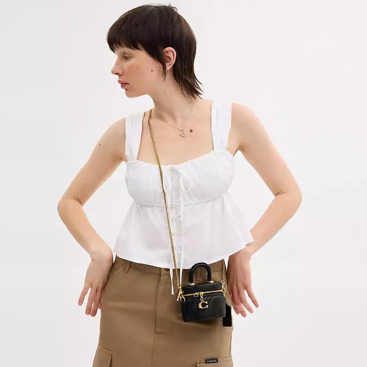 کیف دوشی Trail Crossbody 12 که بر اساس طرح یک مدل Coach از سال ۱۹۹۴ ساخته شده، کمی کوچکتر از مدل اصلی است. این کیف از چرم ناپا فوق‌العاده نرم و مخمل دوخته شده ساخته شده و دارای یک زیپ دور تا دور است که با زیپ مخصوص ما برای ایجاد حس و حال قدیمی تکمیل شده است. این کیف دوشی کوچک با یک دسته زنانه در بالا و یک بند زنجیری براق تکمیل شده است.
