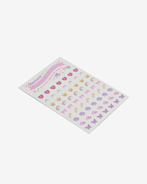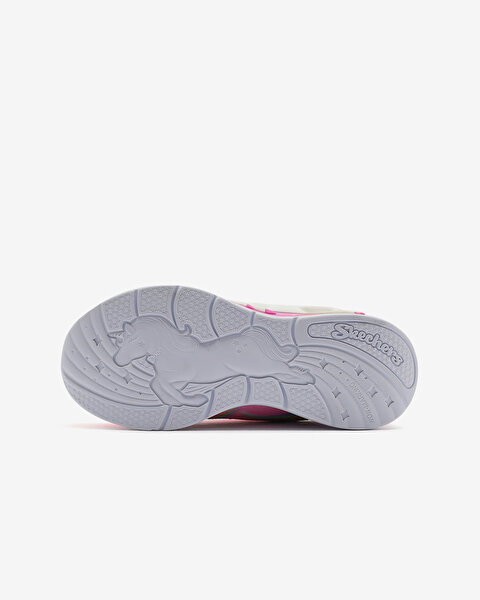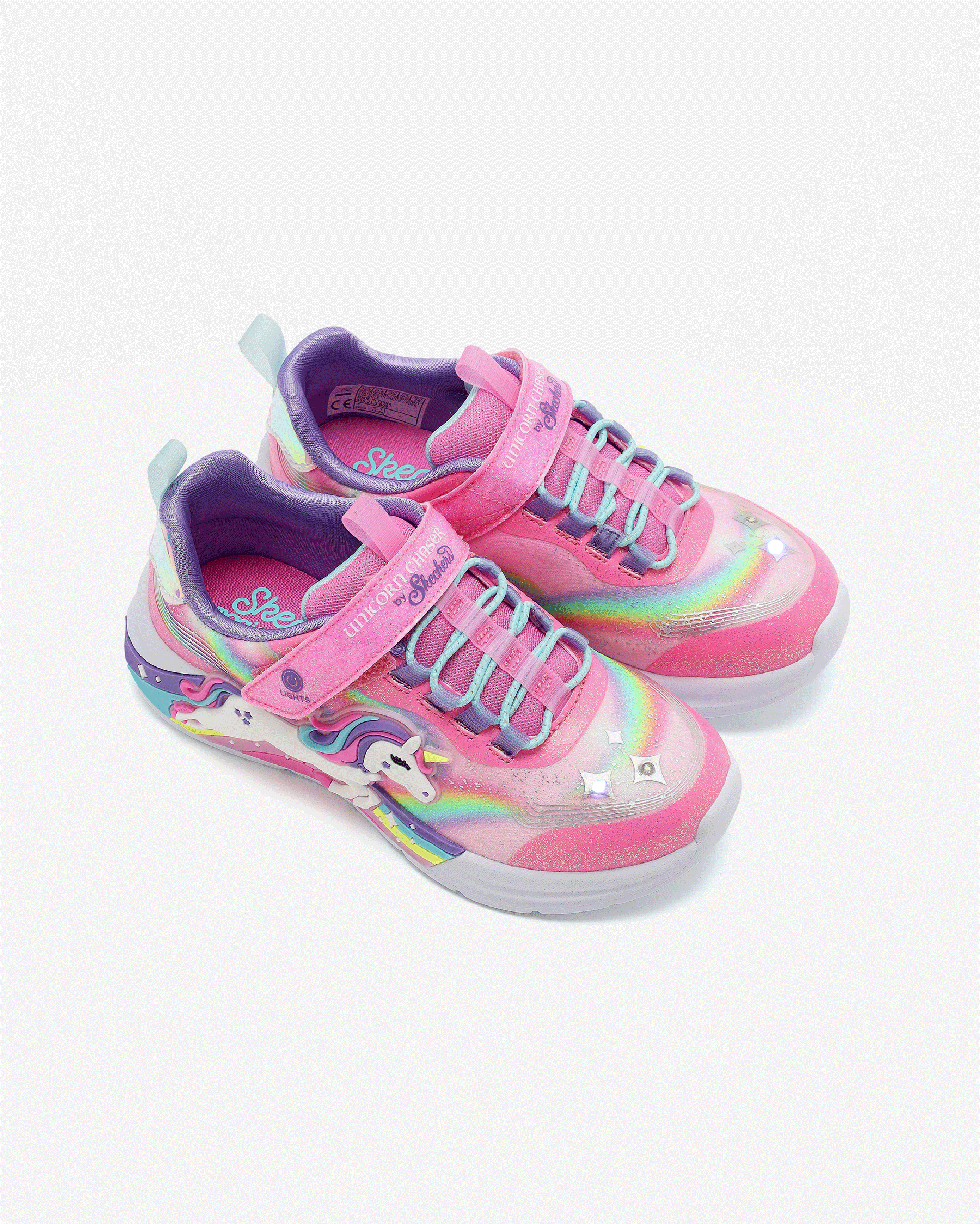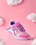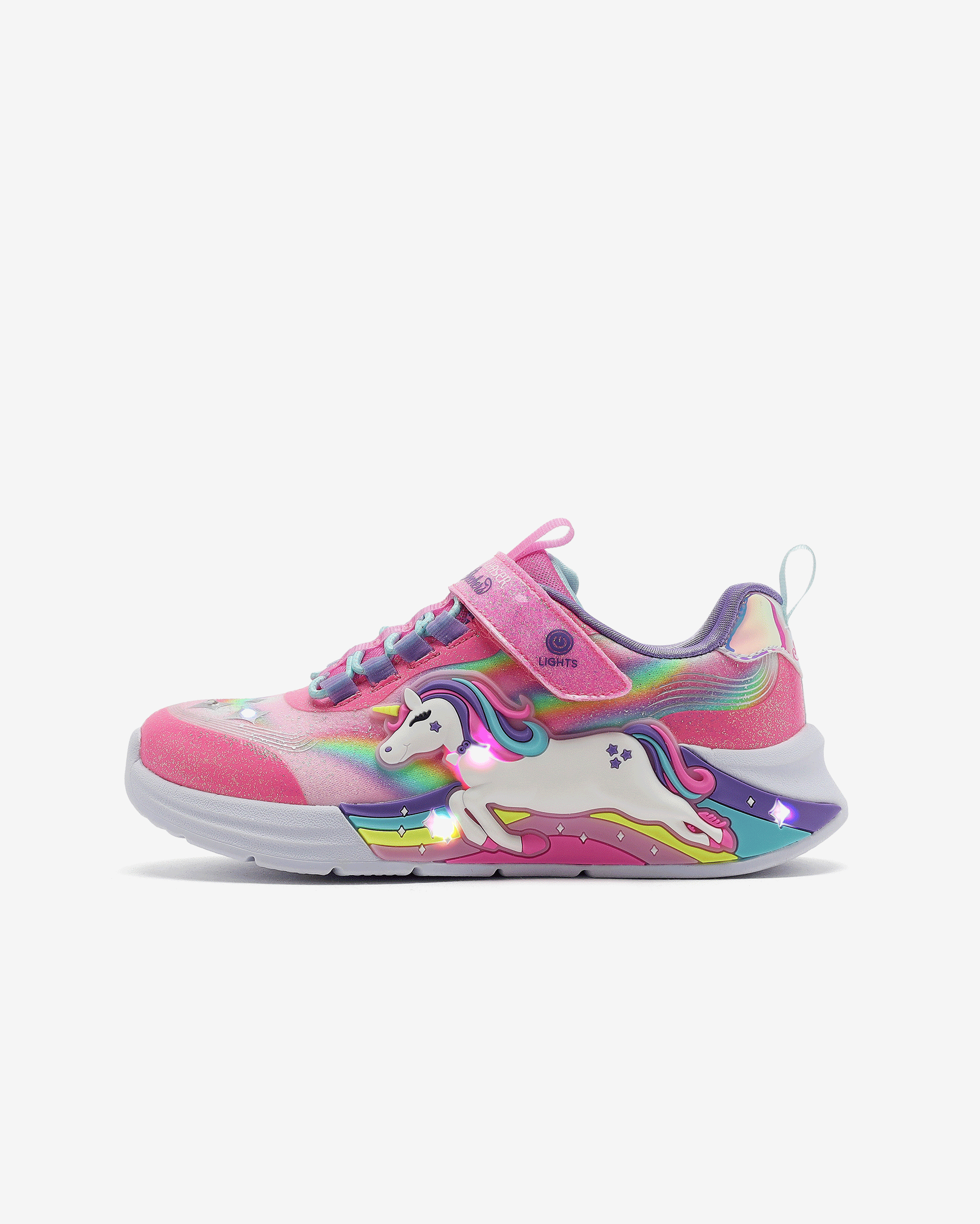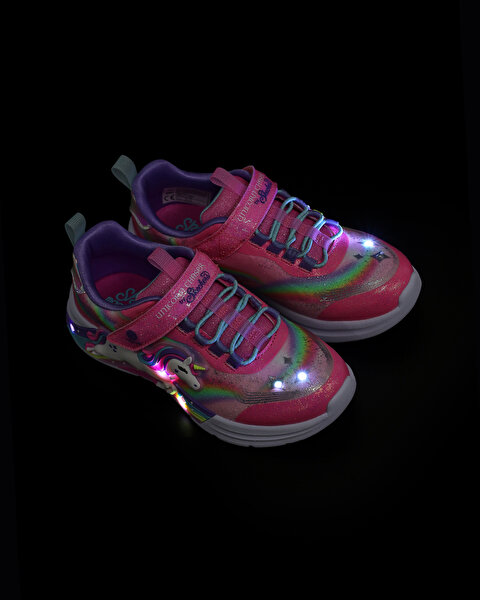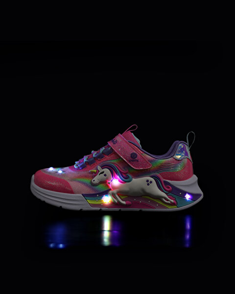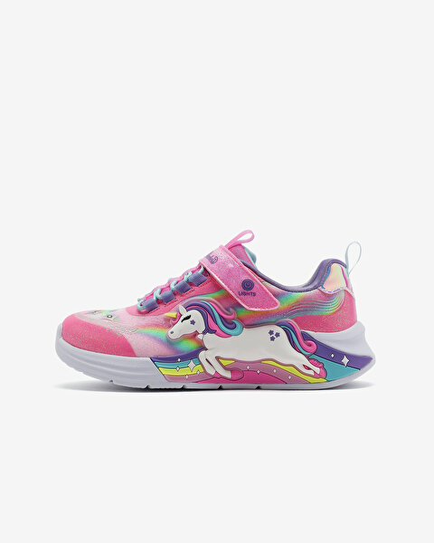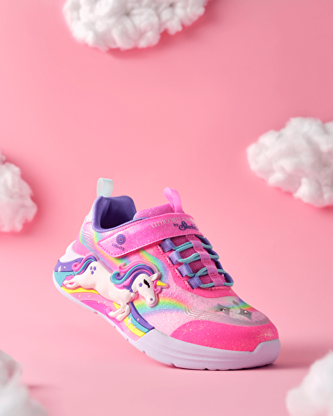 - این کفش دارای رویه اکلیلی مصنوعی با طرح اسب تک شاخ و طرحهای رنگینکمانی در کنارهها است.